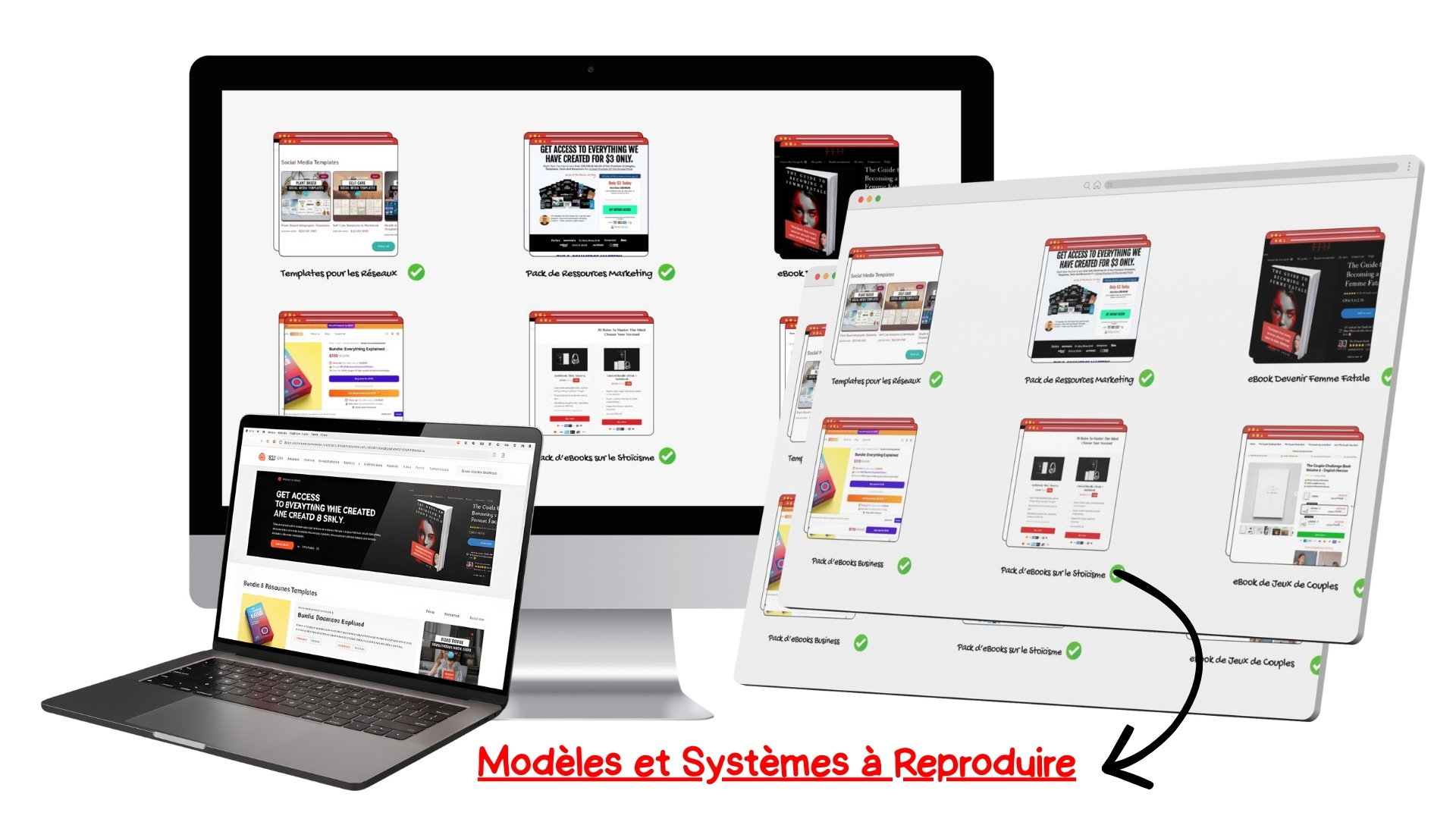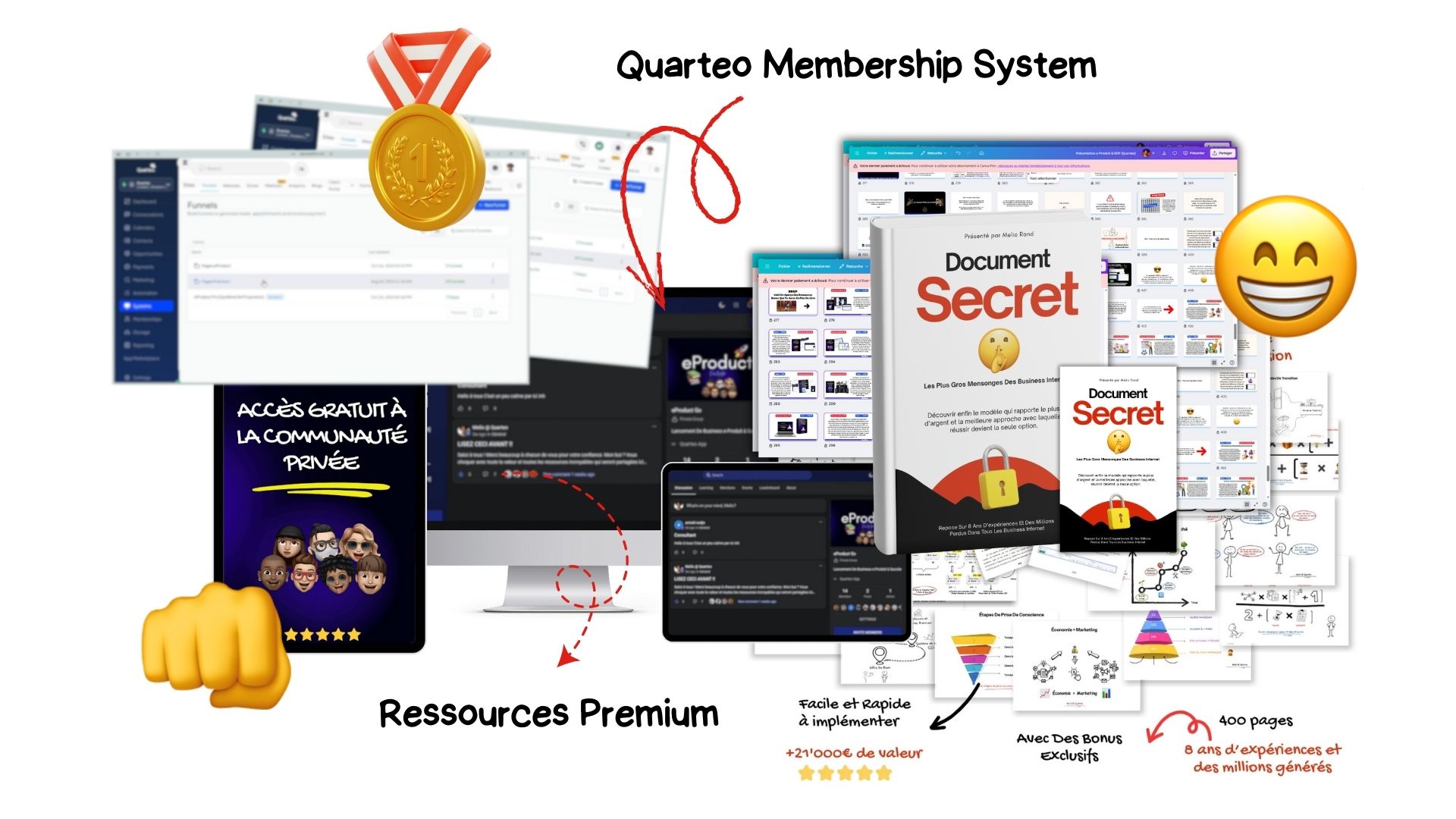 Tu récupères le système complet : secrets, informations, données, guides, ressources, checklists, frameworks, formations, coaching, communauté privée etc. Et même ton propre système que tu peux juste installer, personnaliser et monétiser en quelques clics.