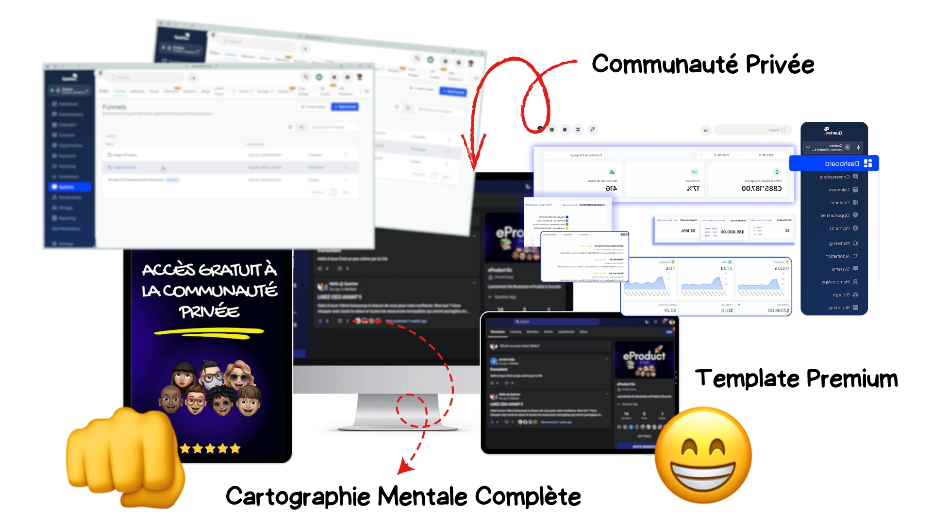 Ensuite, dès que tu comprends ce qu'il faut faire désormais et pourquoi le faire, je te donne accès à un espace membre complet : ressources, systèmes, frameworks, formations, guides, communauté privée.