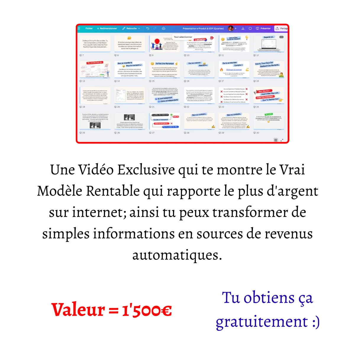 [Valeur : 1'500€] – Une Vidéo Exclusive Complète qui te montre le Vrai Modèle Rentable qui rapporte le plus d'argent sur internet; ainsi tu peux transformer de simples informations en sources de revenus automatiques.