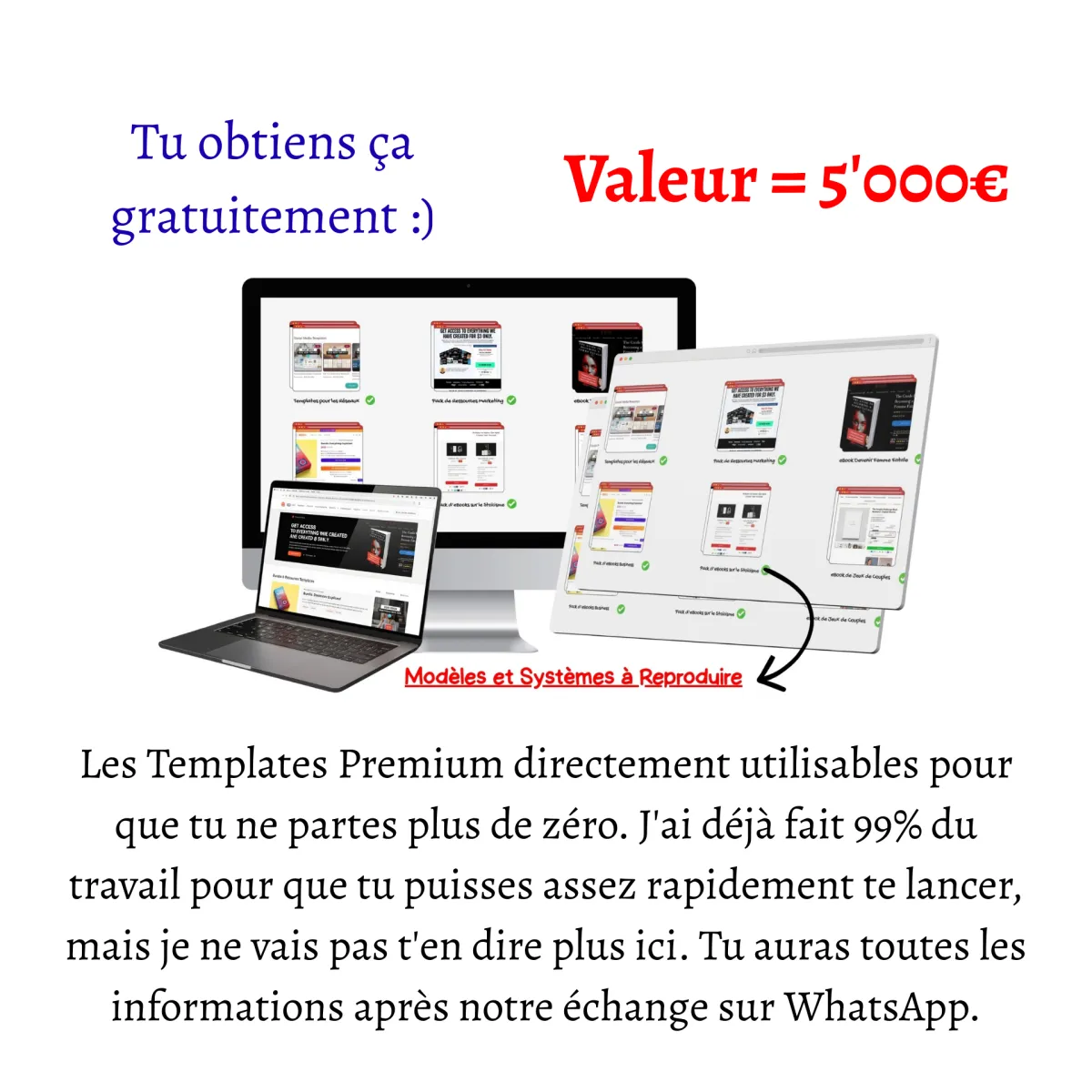 [Valeur : 5'000€] – Les Templates Premium de Conversion avec des structures prêtes à être utilisées pour que tu ne partes plus de zéro. J'ai déjà fait 99% du travail à ta place, mais je ne vais pas t'en dire plus ici. Dès que tu suis la Vidéo Exclusive, tu vas réellement comprendre la valeur de tout ce que j'ai déjà préparé pour ceux qui vont décider travailler avec moi.