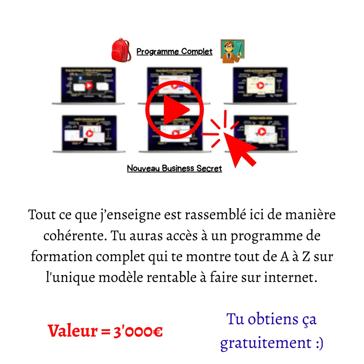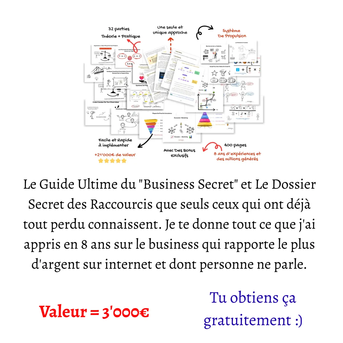 Tu vas recevoir le Document Confidentiel Complet + la Vidéo de Présentation Exclusive et par la suite, tu auras une tonne d'autres ressources incroyables, d'une valeur cumulée de +30'000€.