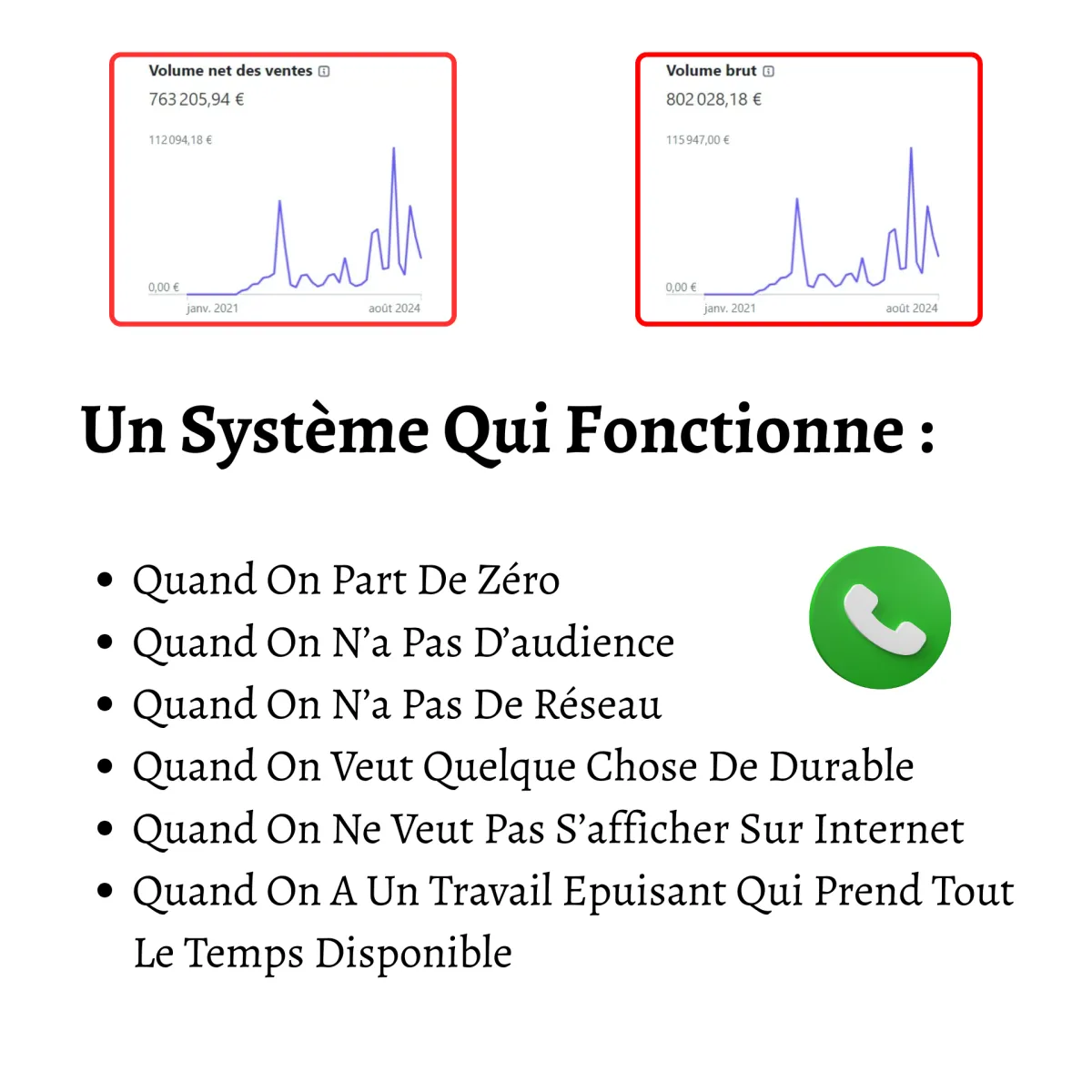 Le système que tu vois ici tourne déjà et c'est un exemple concret qui nous rapporte de l'argent en automatique — ce système vend pendant que je suis libre de faire ce que je veux de mon temps.