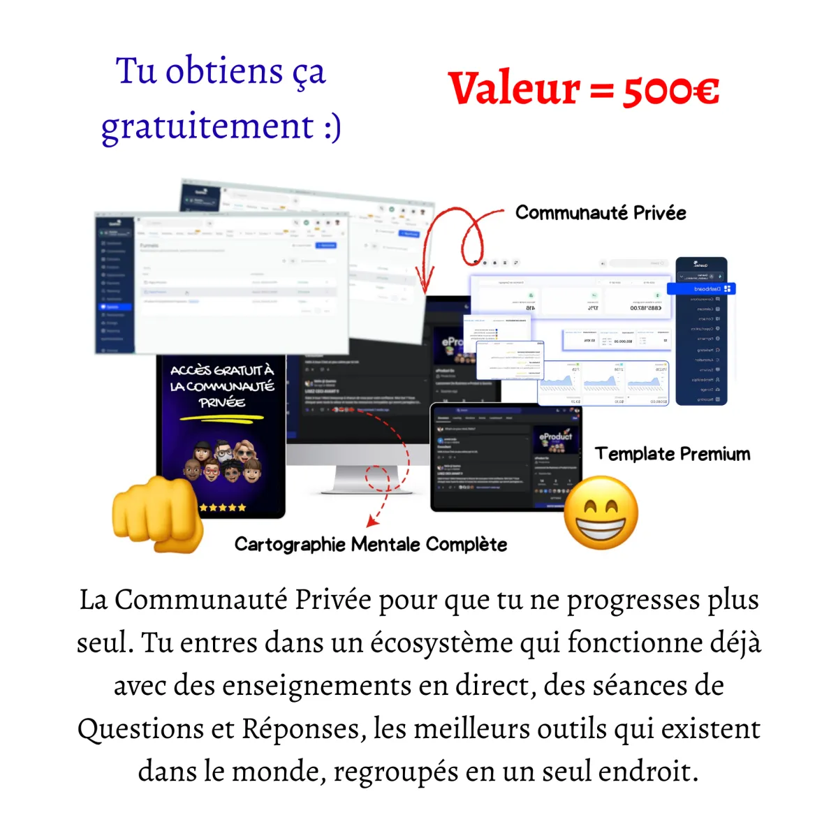 [Valeur : 500€] – La Communauté Privée pour que Tu ne progresses plus seul. Tu entres dans un écosystème qui fonctionne déjà avec des enseignements en direct, des séances de Questions et Réponses, les meilleurs outils qui existent dans le monde, regroupés en un seul endroit..